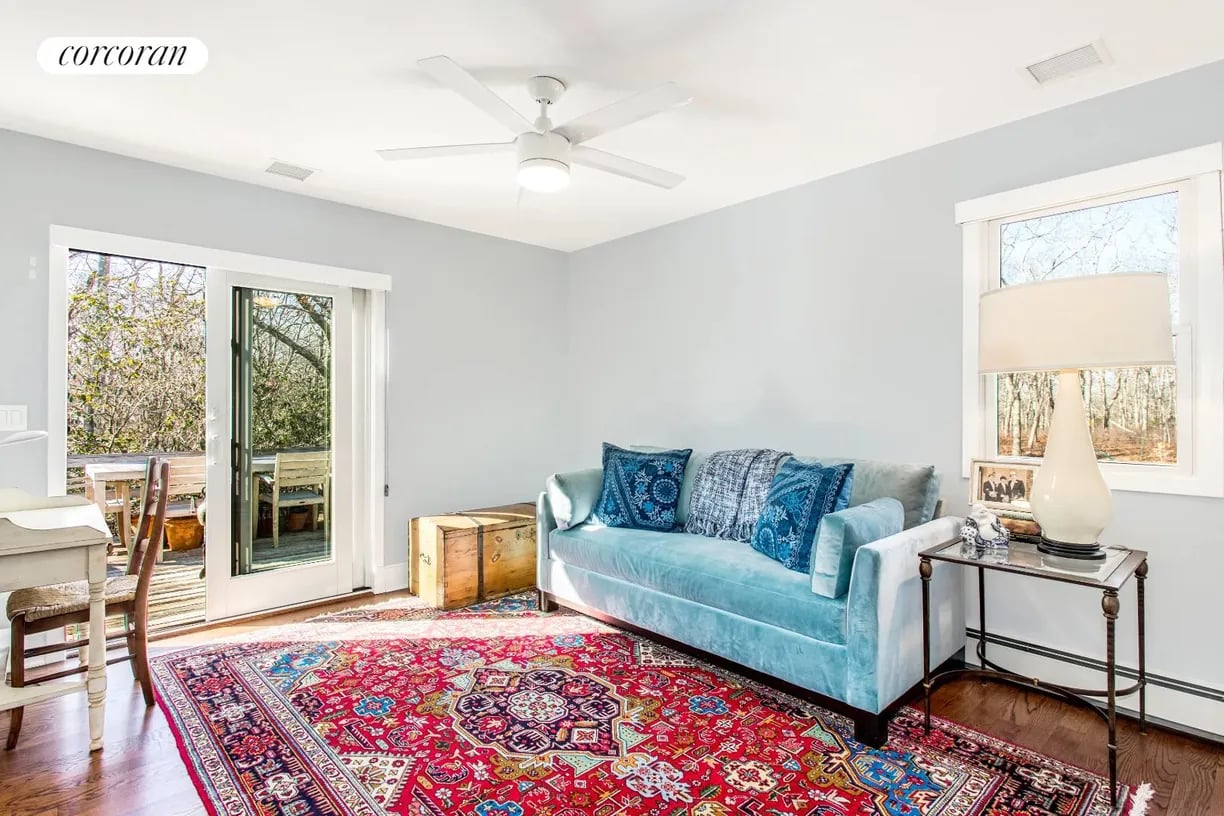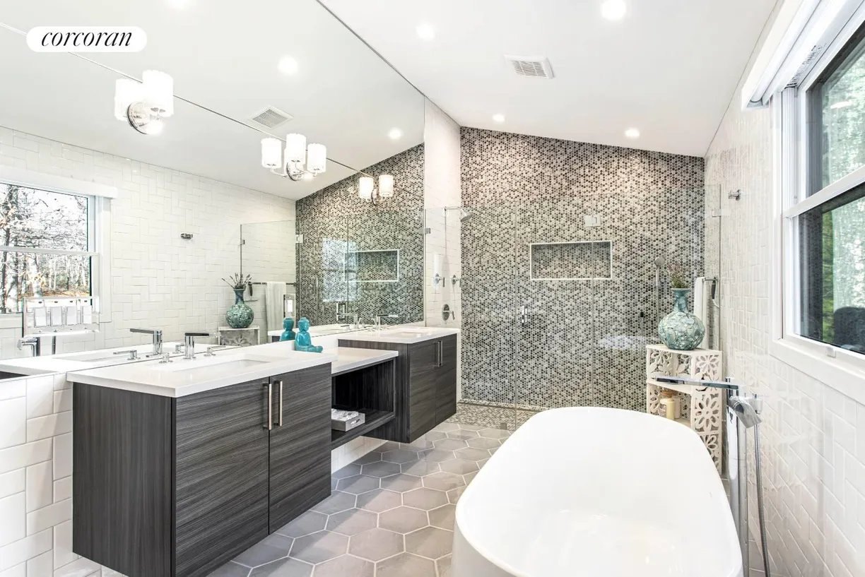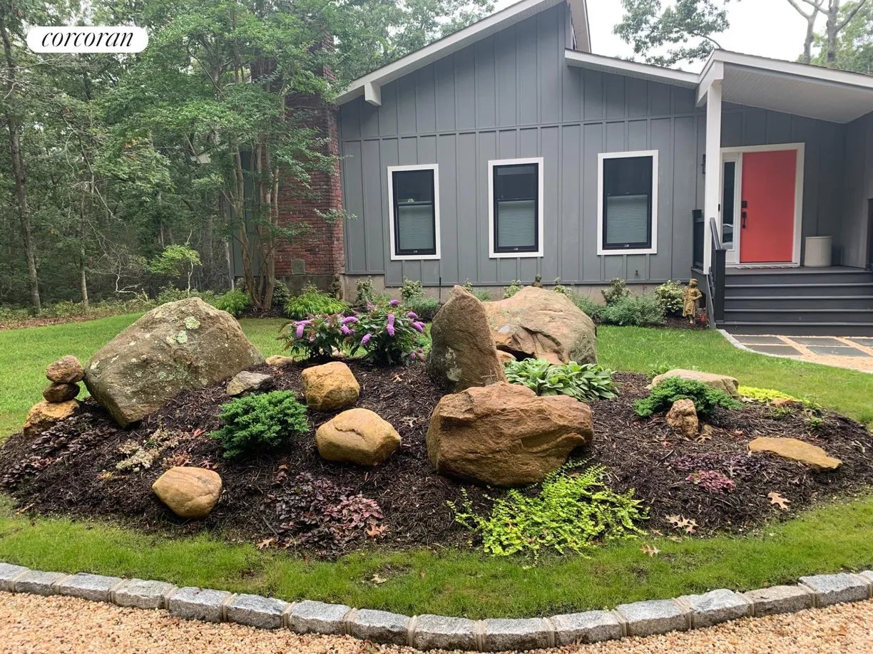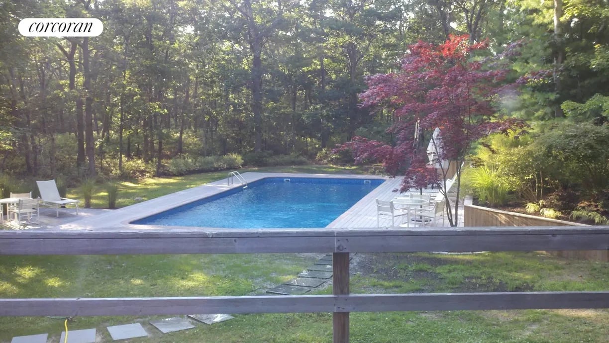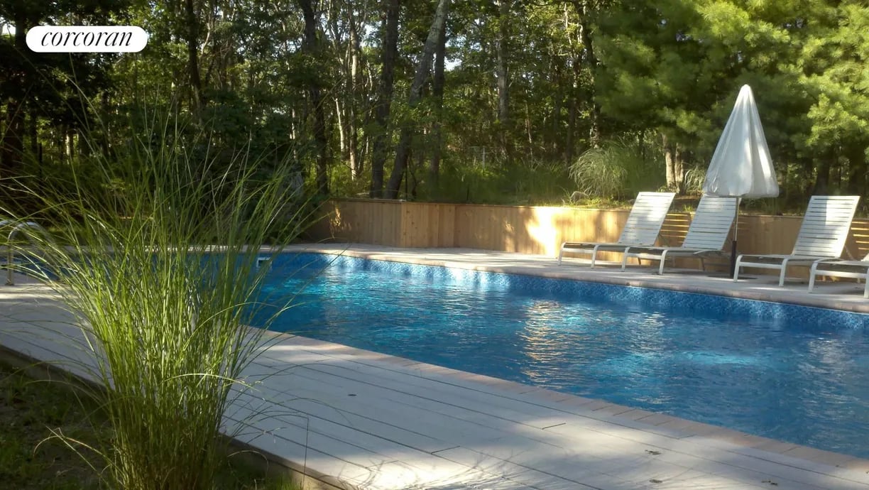 Like-new renovated contemporary in a quiet Sag Harbor setting. The open-floorplan living and dining space features a vaulted ceiling with sky lights, an inviting gas fireplace, and three sunny exposures overlooking a serene wooded landscape and large back deck. The bright and clean new kitchen features quartz countertops, a separate wine refrigerator, a gas range, and a large island that seats four guests. The private spaces of the home are composed of three bedrooms and two full bathrooms. The master suite includes a separate walk-in laundry closet as well as a spa-like master bathroom with an enormous multi-head shower, standalone soaking tub, dual vanities, and a separate water closet. Both the master bedroom and a guest bedroom also offer direct access to the back deck, which leads to the separately fenced sunny pool and pool deck. The third bedroom is currently set up as a home office/study, but a queen bed can be placed in the room for a traditional third bedroom. All interior and exterior surfaces of the home have been recently refreshed or replaced, with new hardwood floors, new double-pane windows, new window treatments, new tile and bathroom fixtures, and fresh paint throughout. An alarm system, one-car garage, and central air complete this immaculately kept home. Centrally located within moments to Sag Harbor Village, Sagaponack, and Bridgehampton. Don't pass this one up.