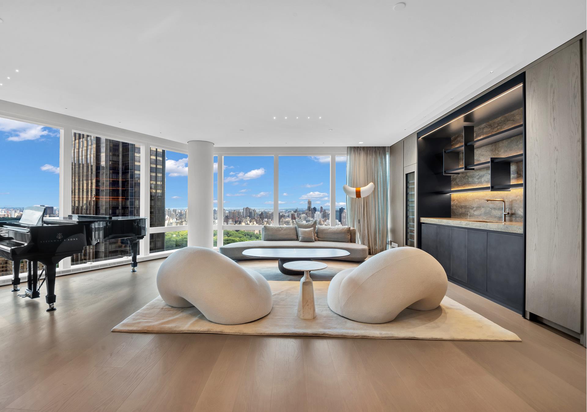 Located at 25 Columbus Circle, this stunning duplex on the 60th and 61st floors offers sweeping views of Central Park and the New York City skyline. Spanning approximately 3,600 square feet, the residence has been meticulously crafted by Thirlwall Design Architects, whose vision for the space embraced organic minimalism with a blend of natural materials and textures. The full renovation masterfully unites two units into a sophisticated space, featuring a custom-designed staircase, bespoke millwork, and high-end finishes throughout. Every detail, from the retractable stove in the kitchen to the cutting-edge entertainment system, showcases exceptional design and craftsmanship.
