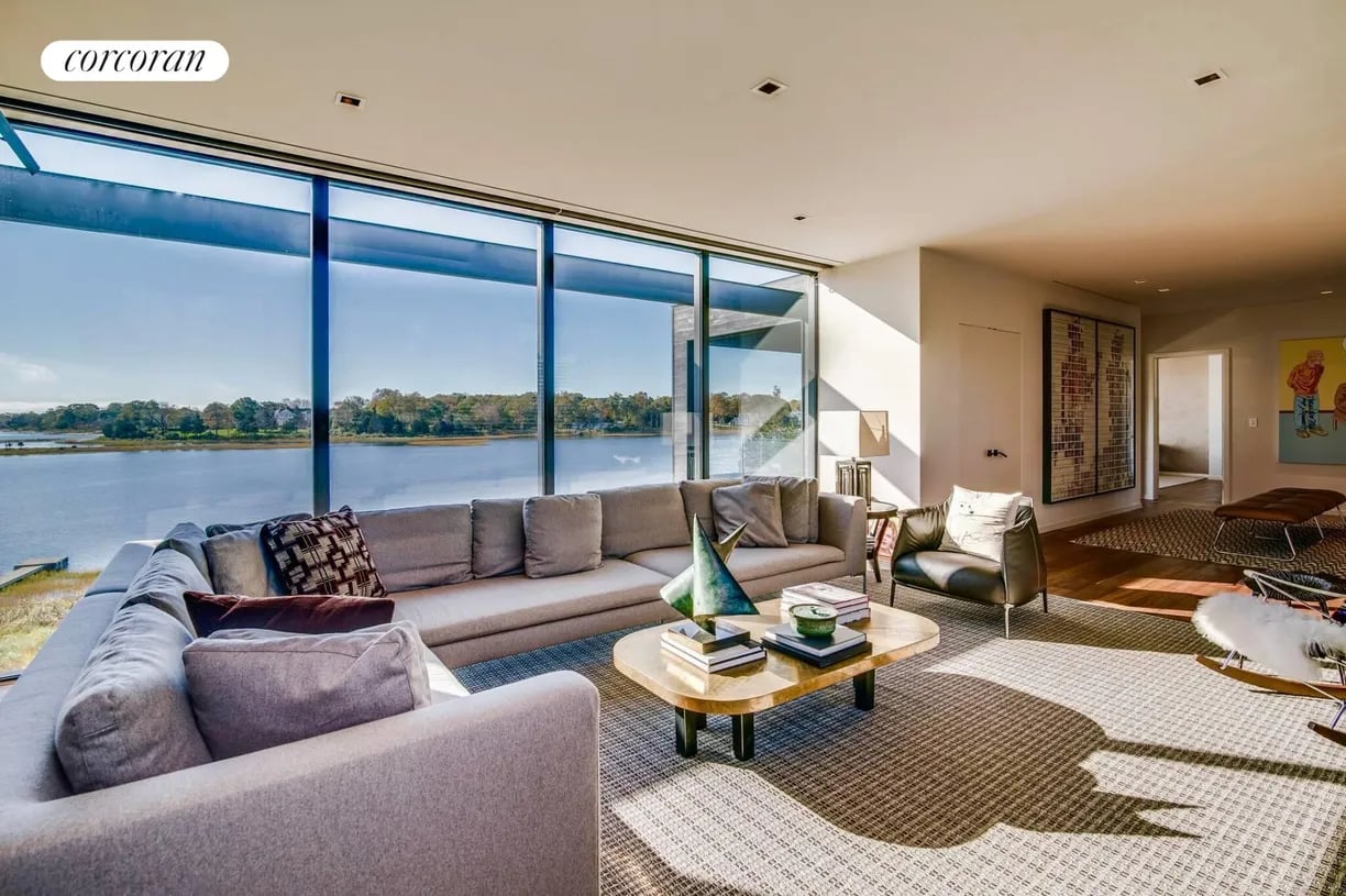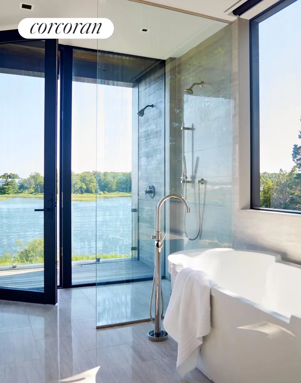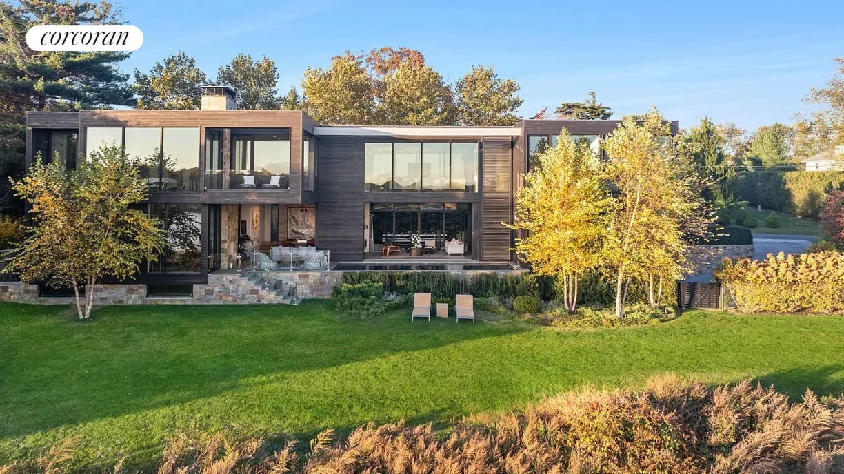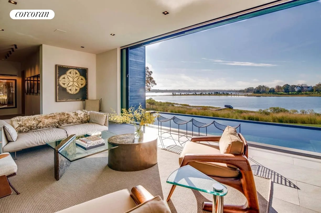 Experience breathtaking panoramic views over iconic Sag Harbor Bay, an important historic whaling port where magnificent luxury yachts now dock in summer. This award-winning waterfront contemporary home was designed by renowned Blaze Makoid Architecture to take maximum advantage of the spectacular setting, and features floor to ceiling windows and doors by Fleetwood throughout, which present the sublime views. Completed in 2017, with five en-suite bedrooms, the home on a full acre is sleek and contemporary with clean lines softened by custom textural elements of wood and stone. Elegant yet comfortable open interiors provide beautiful spaces for entertaining or quiet relaxation. Open wide the pivot glass doors on the front of the home and retractable glass walls in the living and dining rooms to merge indoors and out. The well equipped eat-in kitchen has seating at the quartz-topped island and opens to a rear patio with outdoor seating and dining areas. Another outdoor lounge overlooks the heated gunite pool and the water beyond. All the bedrooms and baths, including two master suites, are impeccably finished and appointed. Enjoy your own 30' dock and two residents only association beaches. Secluded and private, the home is also just minutes to Sag Harbor Village restaurants, shops and historic and cultural destinations. Broker/Owner.