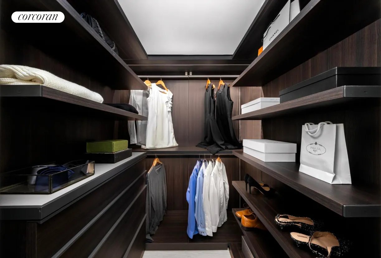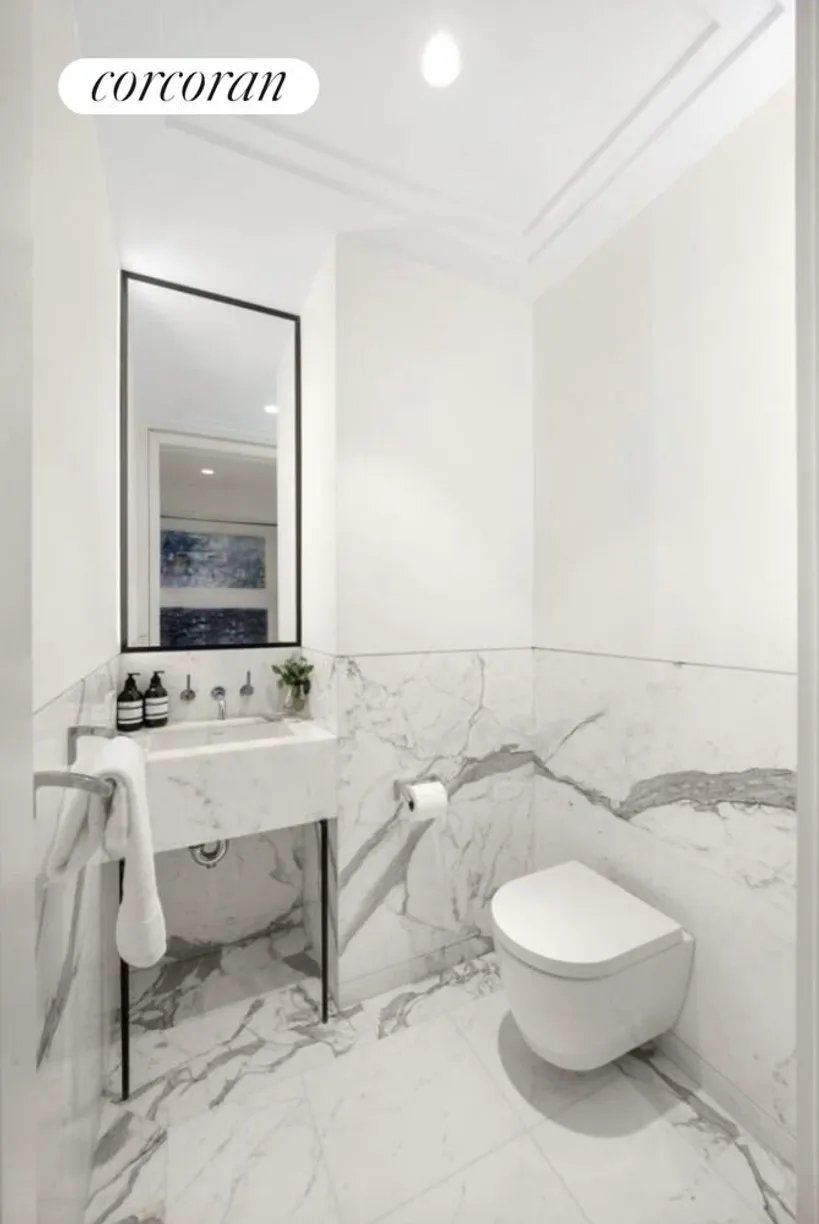 Both bedrooms face south overlooking the building's lush, private courtyard, providing a peaceful escape from the city. The primary suite boasts a custom walk-in closet and a luxurious en suite bath clad in Grigio Dove stone and Calacatta moonlight statuary marble, complete with a double vanity and polished chrome fixtures. The secondary bedroom includes its own elegantly appointed en suite bath. A powder room and thoughtful designer details complete the home.