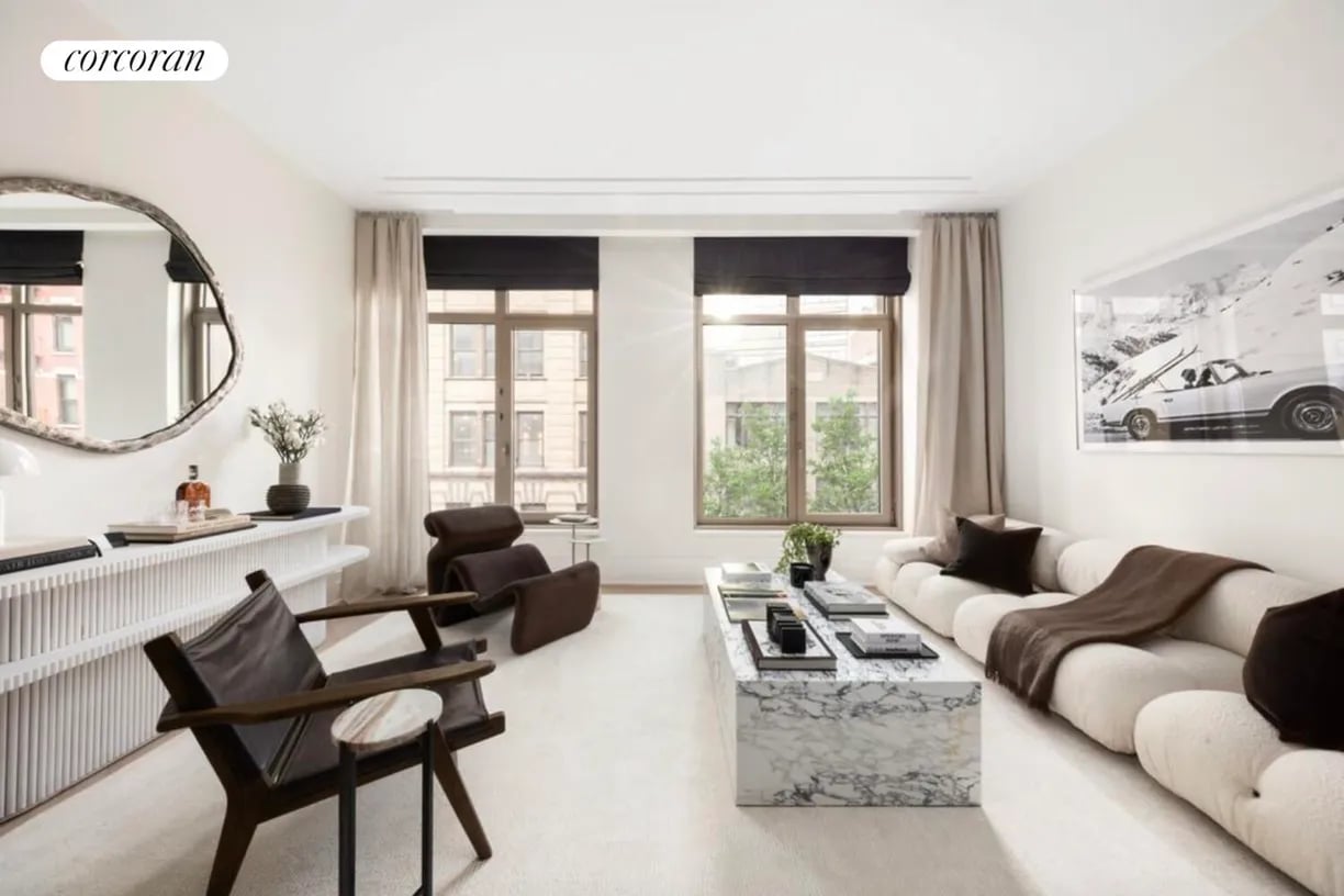 Oversized windows along Bleecker Street fill the open living and dining area with natural light, while 10-foot coved ceilings and chevron-patterned oak floors enhance the home's sense of space and warmth. The Ryan Korban-designed kitchen features a sculptural waterfall island in honed statuary marble, Italian cerused oak cabinetry, fluted bronze-hued glass, and top-of-the-line Miele appliances-all centered beneath a dramatic, book-matched marble hood.