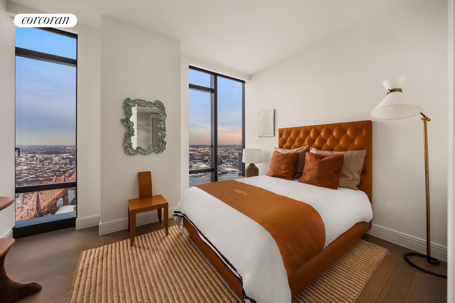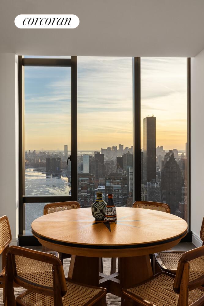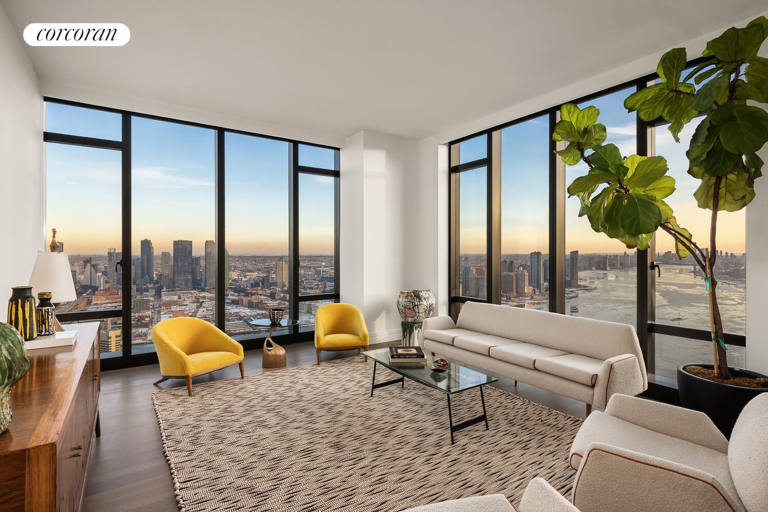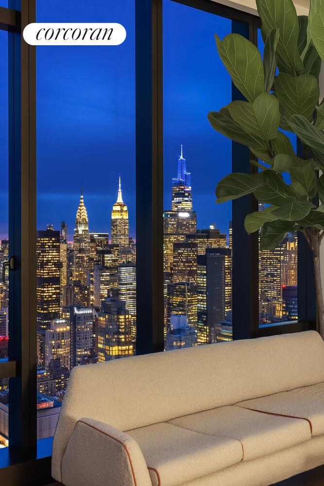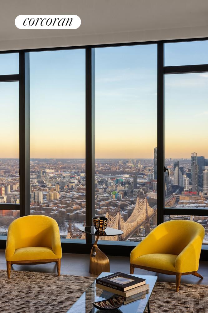 Upon entering the home, a formal entry gallery opens to an expansive living and dining room with south and east exposures and oversized windows that capture dramatic views of the Manhattan skyline, East River and Long Island City.