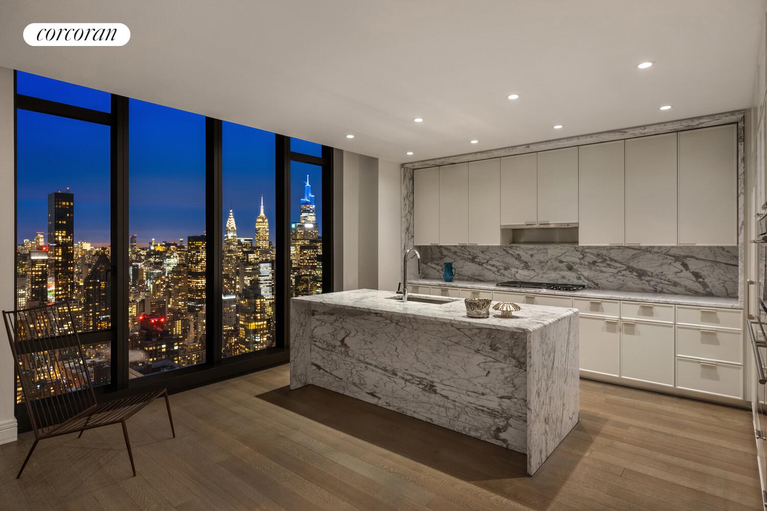 The south-facing eat-in kitchen is elegantly adorned with Statuarietto marble countertops and backsplashes, custom Italian matte lacquer cabinetry, and a fully integrated appliance suite by Sub-Zero and Wolf.