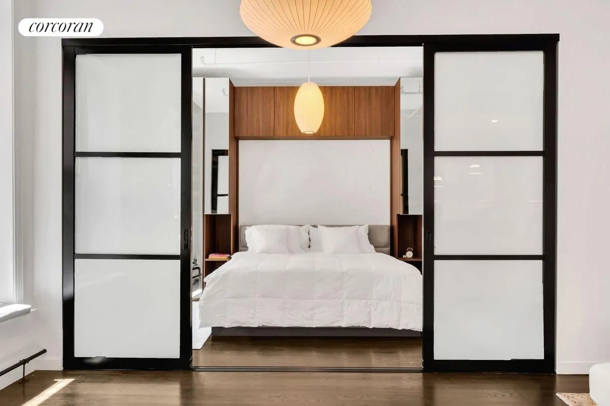 The bedroom is tucked away behind chic pocket doors, enhancing the open flow and maximizing the living space. The chef's kitchen features top-of-the-line Miele appliances, including a built-in wine fridge, perfect for entertaining and everyday living.