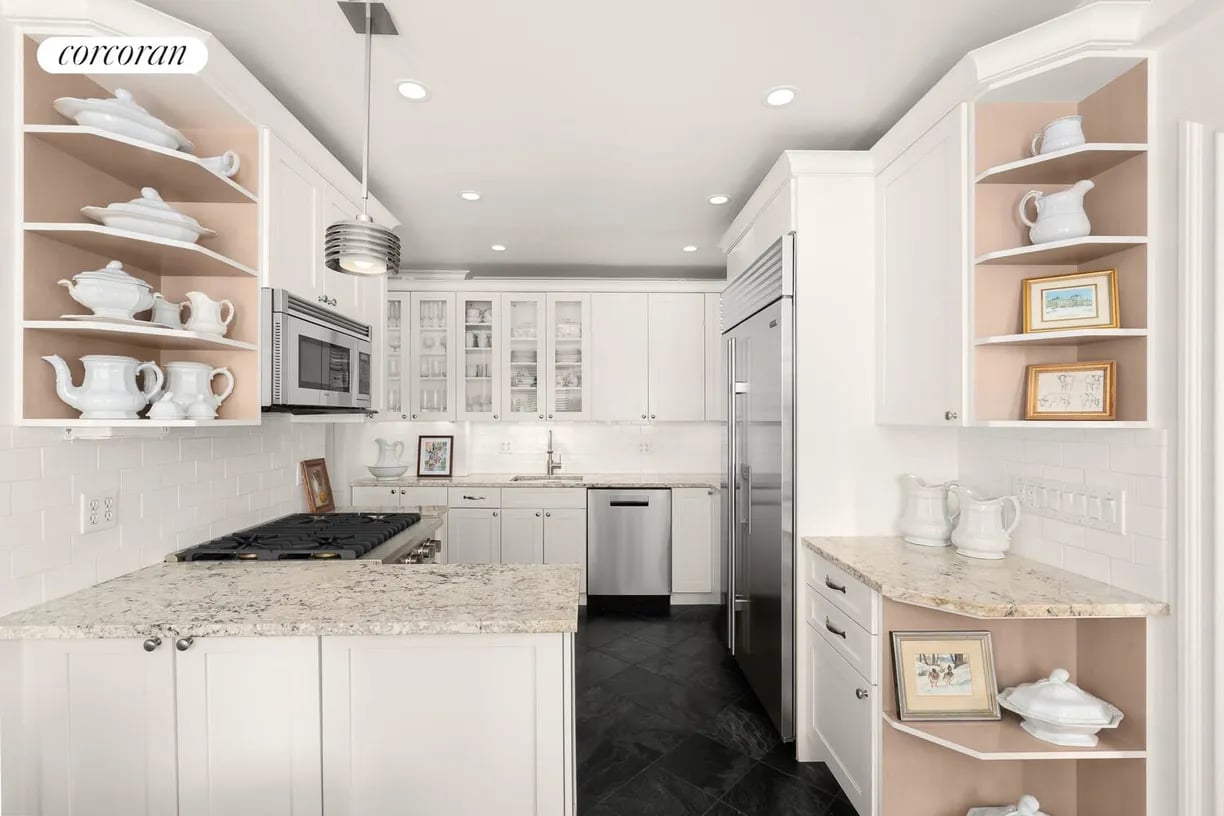 The windowed eat-in kitchen is equipped with a Viking stove, Sub-Zero refrigerator, and generous counter and cabinet space. Both bathrooms have been renovated with quality finishes, and the apartment includes a washer and dryer. The layout offers an expansive flow with well-proportioned bedrooms, large closets including a walk-in in the primary suite, and versatile space for living and entertaining.