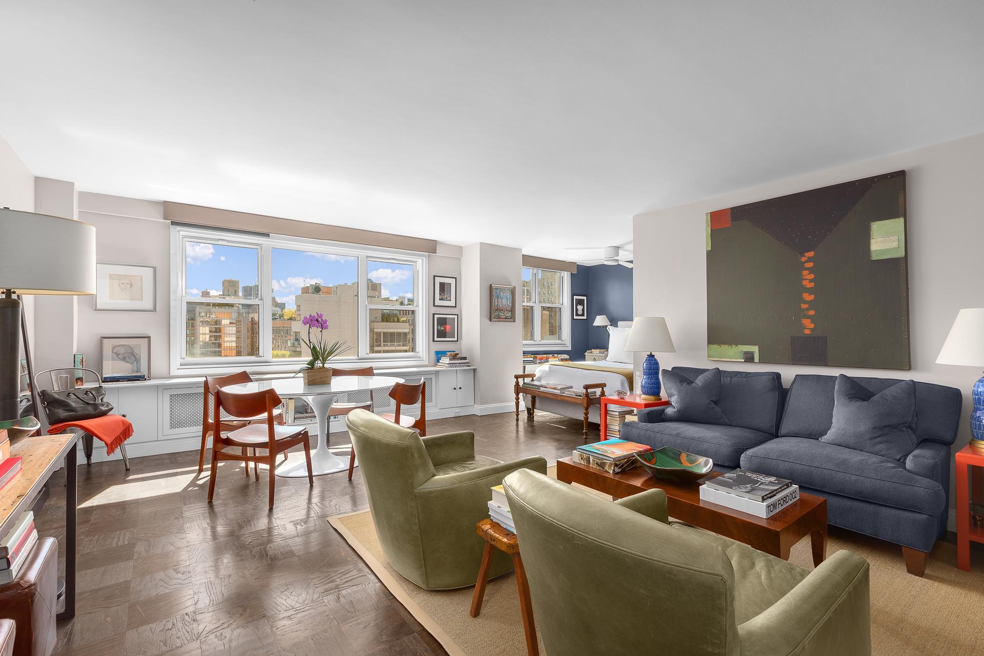 Discover the ultimate blend of serenity and adaptability in this spacious alcove studio at The Vermeer, one of Chelsea's most coveted cooperatives. Perched on a high floor, this sunlit and much-coveted B line unit features a generous layout with a large living area perfect for relaxing or entertaining, complemented by a dedicated dining space. Enjoy stunning city skyline views that bathe the apartment in natural light throughout the day. The sleeping alcove provides a private retreat and can easily be converted into a separate bedroom for enhanced comfort. Additional highlights include a spacious walk-in closet, a newly remodeled kitchen with modern appliances, and a stylishly renovated bathroom.